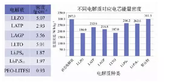 圖表中的縮寫意義:LLZO—鋰鑭鋯氧;LATP—磷酸鈦鋁鋰;LAGP—磷酸鍺鋁鋰;LLTO—鋰鑭鈦氧。鋰離子電池的液態(tài)電解質(zhì)密度為1.1 g/cm3。