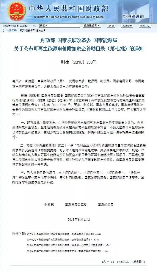 6月15日,財政部、國家發(fā)展改革委、國家能源局發(fā)布《關(guān)于公布可再生能源電價附加資金補助目錄(第七批)的通知 》(財建〔2018〕250號)(以下簡稱《通知》),要求相關(guān)方根據(jù)《財政部 國家發(fā)展改革委 國家能源局關(guān)于印發(fā)<可再生能源電價附加補助資金管理暫行辦法>的通知》(財建〔2012〕102號)和《財政部關(guān)于分布式光伏發(fā)電實行按照電量補貼政策等有關(guān)問題的通知》(財建〔2013〕390號),財政部、國家發(fā)展改革委、國家能源局將符合條件的項目列入可再生能源電價附加資金補助目錄,并在財政部網(wǎng)站上予以公布。