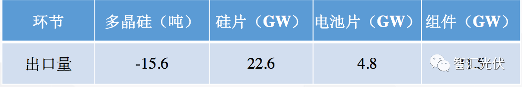 根據(jù)中國(guó)光伏行業(yè)協(xié)會(huì)的數(shù)據(jù),2017年,各環(huán)節(jié)的出口量如下表所示。