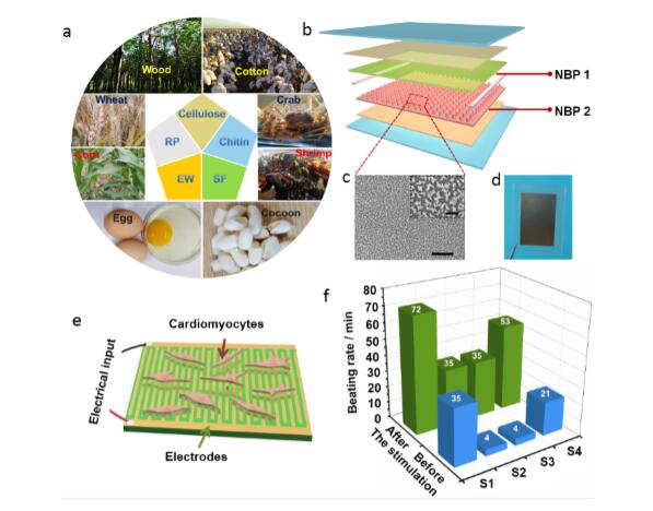 圖:(a) 五種純天然材料來源;(b)- (d) BN-TENG結(jié)構(gòu)示意圖及摩擦層表面結(jié)構(gòu)圖;(e)-(f) BN-TENG作為電源電刺激心肌細(xì)胞