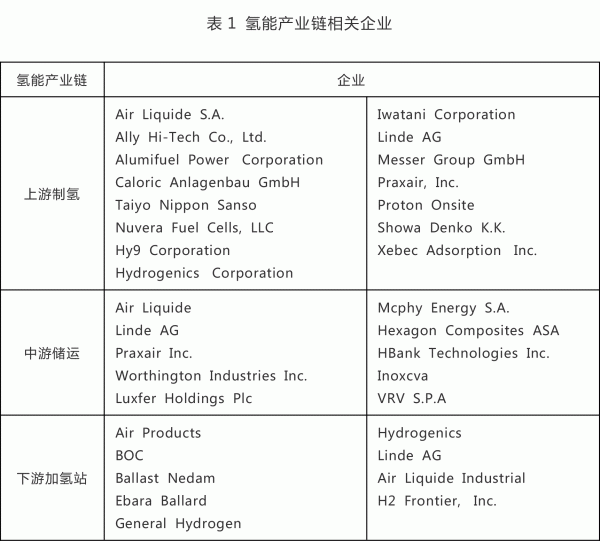 氫能的上游是氫氣的制備,主要技術(shù)方式有傳統(tǒng)能源的化石原料制氫、化工原料制氫、工業(yè)尾氣制氫、電解水制氫、新型制氫技術(shù);中游是氫氣的儲運環(huán)節(jié),主要技術(shù)方式包括高壓氣態(tài)、低溫液態(tài)、固體材料儲氫和有機(jī)液態(tài)儲運;下游是氫氣的應(yīng)用,氫氣應(yīng)用可以滲透到能源的各個方面,除了傳統(tǒng)石化工業(yè)應(yīng)用如合成氨、石油與煤炭深加工外,在新能源應(yīng)用方面包括加氫站、燃料電池下游各種應(yīng)用。產(chǎn)業(yè)鏈相關(guān)企業(yè)見下表。