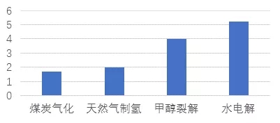 對比幾種主要制氫技術(shù)的成本,煤氣化制氫的成本最低,為1.67美元每千克,其次是天然氣制氫2.00美元/千克,甲醇裂解3.99美元/千克,成本最高的是水電解,達(dá)到5.20美元/千克。相對于石油售價,煤氣化和天然氣重整已有利潤空間,而電解水制氫成本仍高高在上。