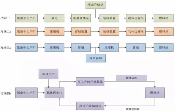 按照氫在輸運時所處狀態(tài)的不同,可以分為氣氫輸送、液氫輸送和固氫輸送。其中前兩者是目前正在大規(guī)模使用的兩種方式。根據(jù)氫的輸送距離、用氫要求及用戶的分布情況,氣氫可以用管道網(wǎng)絡(luò),或通過高壓容器裝在車、船等運輸工具上進(jìn)行輸送。管道輸送一般適用于用量大的場合,而車、船運輸則適合于量小、用戶比較分散的場合。液氫、固氫輸運方法一般是采用車船輸送。