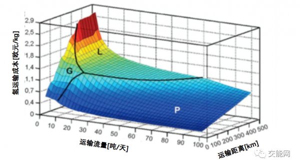 氫輸送成本與質(zhì)量流量和運(yùn)輸距離的關(guān)系圖