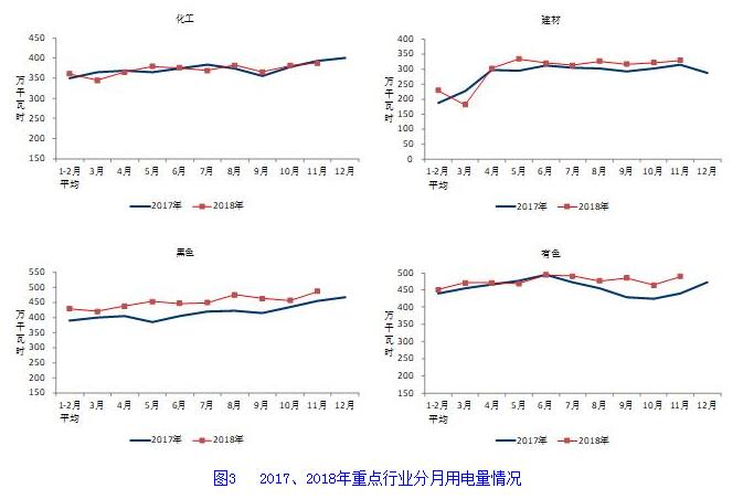 1-11月份,化學(xué)原料制品、非金屬礦物制品、黑色金屬冶煉和有色金屬冶煉四大高載能行業(yè)用電量合計17450億千瓦時,同比增長6.0%;合計用電量占全社會用電量的比重為28.1%,對全社會用電量增長的貢獻(xiàn)率為20.5%。其中,化工行業(yè)用電量4073億千瓦時,同比增長2.6%;建材行業(yè)用電量3203億千瓦時,同比增長5.8%;黑色金屬冶煉行業(yè)用電量4941億千瓦時,同比增長10.3%;有色金屬冶煉行業(yè)5234億千瓦時,同比增長5.1%。