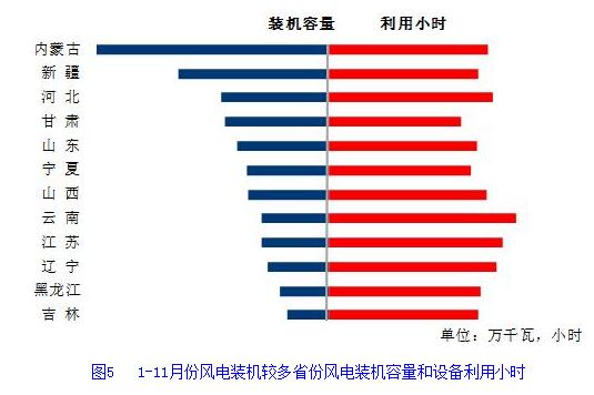 分類型看,1-11月份,全國水電設(shè)備平均利用小時為3358小時,比上年同期增加60小時。在水電裝機容量超過1000萬千瓦的8個省份中,青海、云南、廣西和四川同比分別增加1474、311、132和11小時,湖南、廣東、湖北和貴州同比分別降低540、74、57和22小時;全國火電設(shè)備平均利用小時為3946小時(其中,燃煤發(fā)電設(shè)備平均利用小時4047小時),比上年同期增加175小時。分省份看,全國共有12個省份火電設(shè)備利用小時超過全國平均水平,其中江西、內(nèi)蒙古、河北和安徽超過4500小時,寧夏、山東和江蘇超過4200小時,福建、海南、天津、湖北和陜西超過4000小時,而云南和西藏僅為1477和277小時。與上年同期相比,共有24個省份火電利用小時同比增加,其中,廣西增加717小時,福建、甘肅、湖北和湖南增加超過500小時,重慶、內(nèi)蒙古、四川和安徽增加超過400小時,而青海降低1143小時,寧夏、江蘇、陜西和上海下降超過100小時,分別降低223、204、182和104小時。全國核電設(shè)備平均利用小時6791小時,比上年同期增加287小時;全國并網(wǎng)風(fēng)電設(shè)備平均利用小時1891小時,比上年同期增加139小時;全國太陽能發(fā)電設(shè)備平均利用小時1148小時。