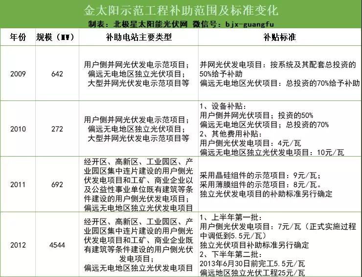 金太陽(yáng)工程:2009年7月,財(cái)政部、科技部、國(guó)家能源局聯(lián)合發(fā)布《關(guān)于實(shí)施金太陽(yáng)示范工程的通知》,計(jì)劃在2~3年內(nèi),采取財(cái)政補(bǔ)助方式支持不低于500MW的光伏發(fā)電示范項(xiàng)目。而具體的補(bǔ)助范圍和金額也在接下來(lái)的2009~2012年進(jìn)行了逐年調(diào)整,見(jiàn)下表: