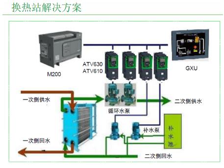 施耐德電氣御程系列變頻器AVT6X0/9X0系列低壓變頻器憑借業(yè)界極端環(huán)境下運(yùn)行和10年長壽命設(shè)計,配合M200PLC和GXU系列觸摸屏成為換熱站*解決方案