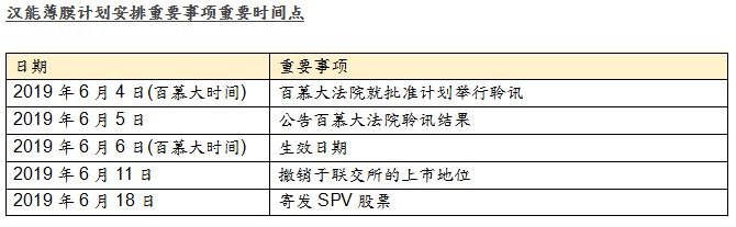 百慕大法院將在6月4日就有關(guān)計(jì)劃進(jìn)行法院聆訊,聆訊結(jié)果將會(huì)在6月5日公布。漢能薄膜于香港聯(lián)交所的上市地位預(yù)計(jì)在6月11日撤銷。這次計(jì)劃完成后,所有計(jì)劃股份將會(huì)被注銷,每股漢能薄膜獨(dú)立股東的股份將被兌換為一股SPV股份,獨(dú)立股東將通過SPV股份持有日后中國A股上市公司股份,而SPV股票將在6月18日寄發(fā)給獨(dú)立股東。