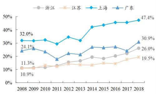 因此,東部沿海省份用電量結構近年來逐步發(fā)生改變,外來電占比不斷攀升,浙江、江蘇、上海、廣東等地外來電占比由2008年的11.3%、10.9%、32.0%、24.1%上升至2018年的26.0%、19.5%、47.4%、30.9%。
