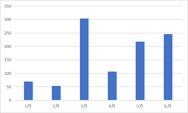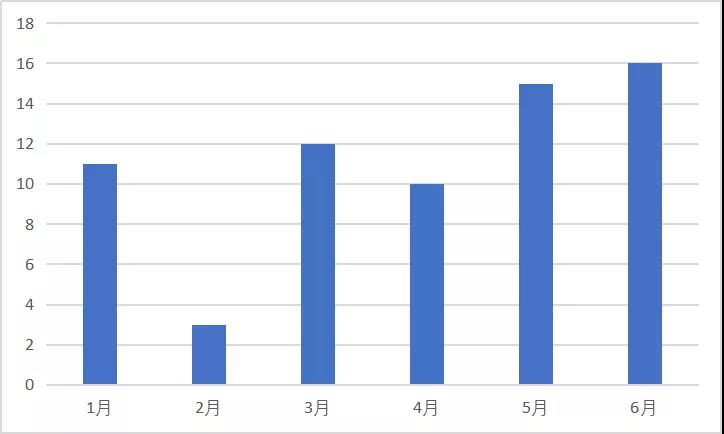圖1 2019年上半年各月份投資項(xiàng)目數(shù)量情況(單位:個(gè))來源:氫云鏈整理