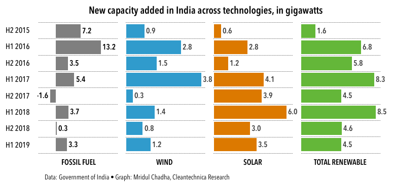 今年上半年,太陽能發(fā)電技術對印度新增發(fā)電能力的貢獻最大。在2019年1月至6月期間增加的7.8吉瓦新增產能中,太陽能占3.5吉瓦。