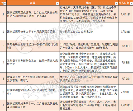 7月,國家政策主要包括光伏補(bǔ)貼競(jìng)價(jià)機(jī)制、戶用光伏市場(chǎng)、財(cái)政部調(diào)整可再生能源補(bǔ)貼、光伏取暖等。