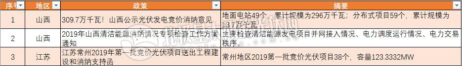 另,常州地區(qū)2019年第一批競(jìng)價(jià)光伏項(xiàng)目共計(jì)38個(gè),容量123.3332MW,國網(wǎng)江蘇電力公司常州分公司對(duì)消納能力進(jìn)行了分析,最終是否具備接入和消納條件以接入系統(tǒng)評(píng)審意見為準(zhǔn)。