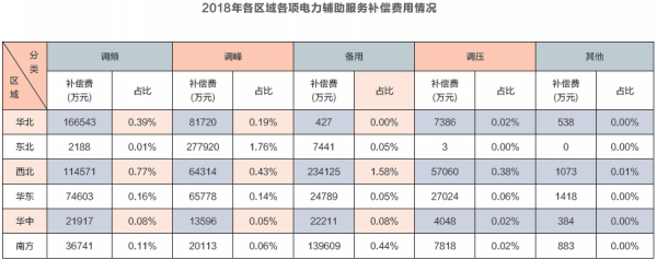 這種以計劃補償為特征的電力輔助服務模式迄今仍在全國運行。2018年,全國除西藏外31個?。▍^(qū)、市、地區(qū))參與電力輔助服務補償的企業(yè)4176家,裝機容量13.21億千瓦,補償費用147.62億元,占上網電費總額0.83%。西北地區(qū)電力輔助服務補償費用占上網電費總額比例最高為3.17%。