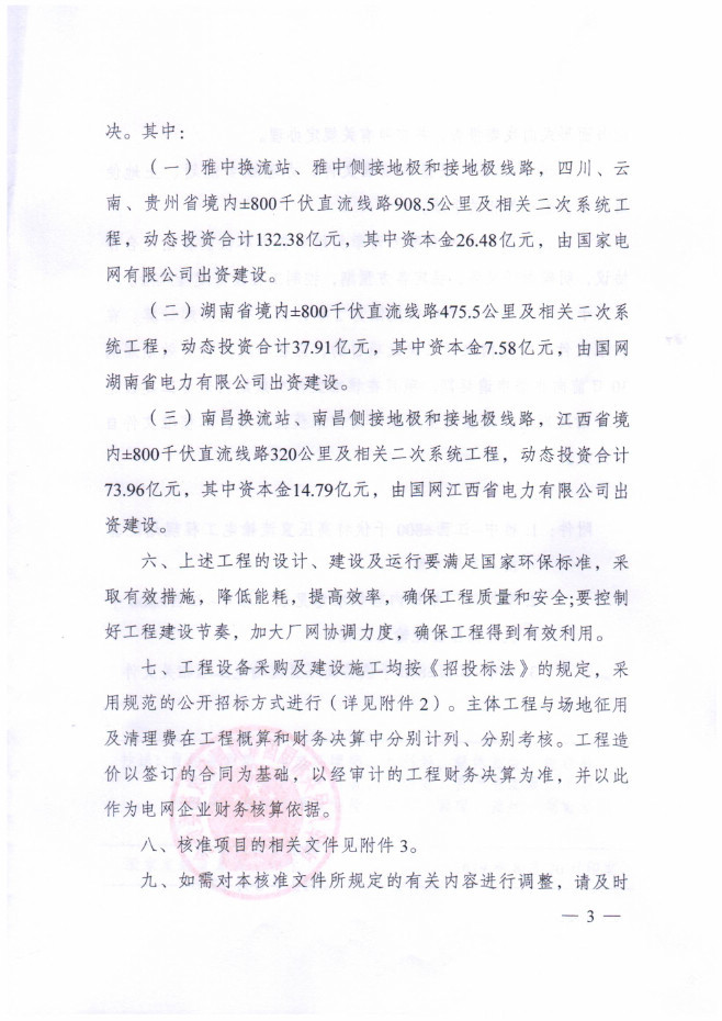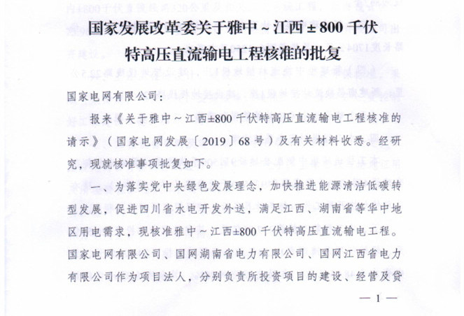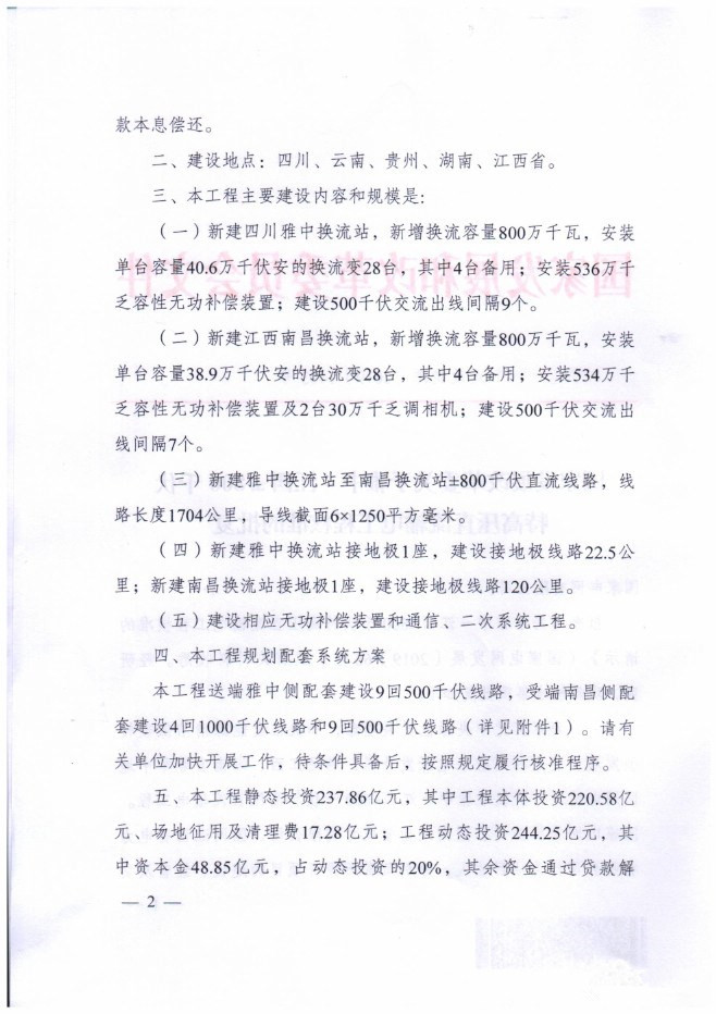 國家發(fā)改委日前發(fā)布了《關(guān)于雅中-江西±800kV特高壓直流輸電工程核準(zhǔn)的批復(fù)》,新建±800kV送端換流站(以下簡(jiǎn)稱“送端換流站”)及其接地極、接地極線路;新建±800kV受端換流站(以下簡(jiǎn)稱“受端換流站”)及其接地極、接地極線路;新建雅中-江西±800kV直流輸電線路(以下簡(jiǎn)稱“直流線路”)約1704km。詳情如下: