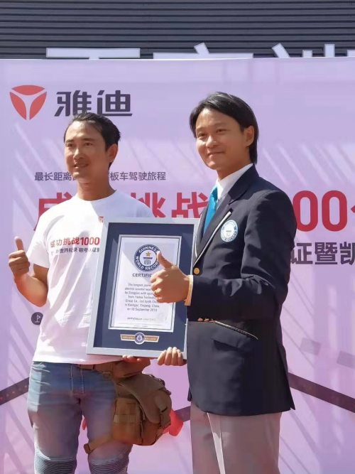 2019年9月10日,宋健先生作為“雅迪10000公里吉尼斯世界紀(jì)錄”的挑戰(zhàn)者,成功到達(dá)了挑戰(zhàn)旅程的終點(diǎn)——新疆喀什。2個月前,他騎乘雅迪G5從被稱為“中國最東端”的撫遠(yuǎn)市出發(fā),正式開啟“最長距離的電動踏板車駕駛旅程”的吉尼斯世界紀(jì)錄挑戰(zhàn)之旅,路途先后經(jīng)過寧夏等省(直轄市),最終抵達(dá)喀什,完成了這次吉尼斯世界紀(jì)錄挑戰(zhàn)的最終認(rèn)證。新的吉尼斯世界紀(jì)錄就此誕生!
