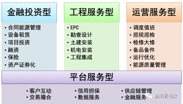 為投資方提供工程項目服務(wù)的能源服務(wù)公司,屬于工程服務(wù)型。比如之前跑路條就是一個專業(yè)服務(wù),還包括勘查設(shè)計、土建安裝、機電安裝、工程調(diào)試等,還有就是提供工程總承包的EPC方。