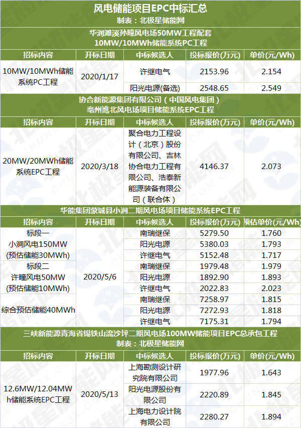 2020年初,多個(gè)風(fēng)電配套儲(chǔ)能項(xiàng)目陸續(xù)開(kāi)標(biāo),據(jù)北極星儲(chǔ)能網(wǎng)統(tǒng)計(jì),同樣都是1C的電池儲(chǔ)能成本價(jià)格從1月份最高2.549元/Wh到5月已經(jīng)降到最低1.643元/Wh,一個(gè)季度儲(chǔ)能成本下降近三成。