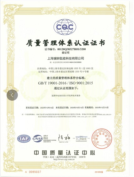 今年10月,驥翀氫能正式通過ISO9001質(zhì)量管理體系認(rèn)證;