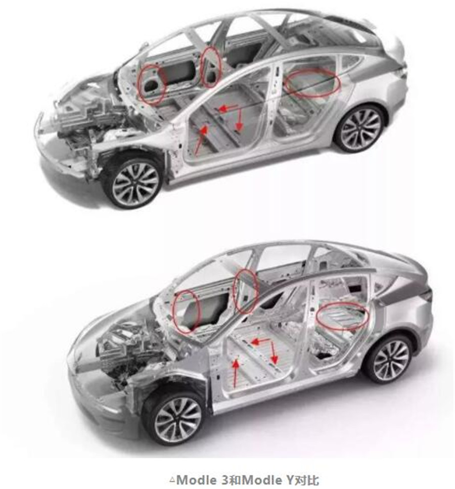 而且Model Y的零件不但可以享受規(guī)模效應(yīng),還將能用上大批新的降成本技術(shù)。舉個(gè)例子,Model Y有一項(xiàng)新專利是關(guān)于一體沖壓成型車身的工藝,將過去單個(gè)零部件沖壓再拼裝的過程一步到位,這會(huì)顯著的降低生產(chǎn)成本。