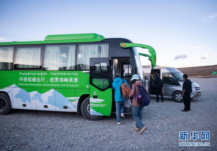 游客在珠穆朗瑪峰景區(qū)停車場(chǎng)轉(zhuǎn)乘環(huán)??蛙?2019年5月16日攝)。珠穆朗瑪峰景區(qū)內(nèi)自2019年5月開始試運(yùn)營清潔能源環(huán)??蛙?,以進(jìn)一步平衡珠峰地區(qū)旅游發(fā)展與環(huán)境保護(hù)需要。新華社記者 孫非 攝