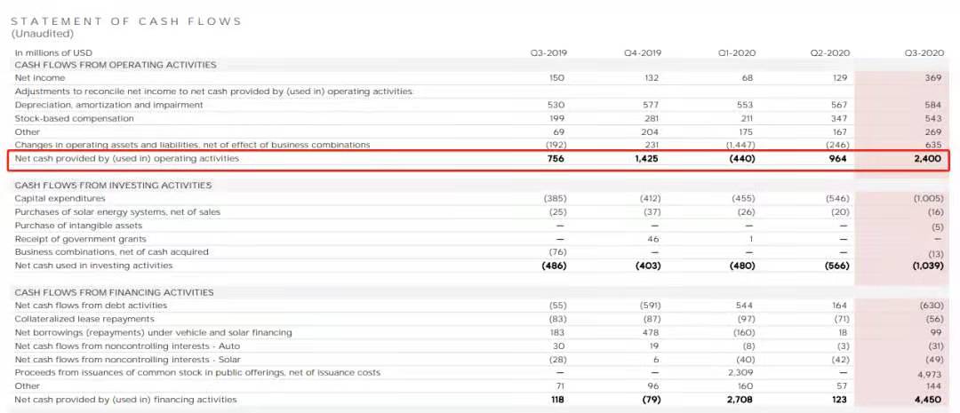 作為一家電動車企業(yè),特斯拉經(jīng)營活動產(chǎn)生的現(xiàn)金流為正(一季度中國市場疫情影響導(dǎo)致現(xiàn)金流異常),而且三季度相比去年翻了兩番,這也說明電動車業(yè)務(wù)確實(shí)能給特斯拉創(chuàng)造實(shí)實(shí)在在的現(xiàn)金流,并且電動車上的業(yè)務(wù)模式得到了相應(yīng)的資本回報,而不是越賣越虧。