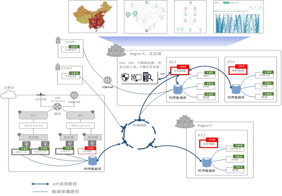 在中期階段,客戶業(yè)務(wù)逐步上云,云建設(shè)的規(guī)模更大,同時(shí)開始關(guān)注容器網(wǎng)絡(luò)以及業(yè)務(wù)保障。這時(shí)客戶更多地關(guān)注多區(qū)域多資源池以及underlay和overlay的統(tǒng)一管理、對于多云異構(gòu)環(huán)境有統(tǒng)一網(wǎng)絡(luò)全景圖的需求、對虛擬網(wǎng)絡(luò)的故障診斷需求也浮出水面??蛻衾砟钌弦膊辉僬J(rèn)為云環(huán)境的網(wǎng)絡(luò)保障可單純地通過存儲、分析全包來解決。此時(shí)面臨的多點(diǎn)多地管理,Overlay網(wǎng)絡(luò)中的Trouble shooting等問題也很突出。DeepFlow®方案著重面向客戶大規(guī)?;旌显凭W(wǎng)絡(luò)的整體監(jiān)控,包括多數(shù)據(jù)中心、多分支機(jī)構(gòu)、私有云和公有云的整體網(wǎng)絡(luò)全景圖,解決專線鏈路負(fù)載、公有云網(wǎng)絡(luò)性能、私有云故障排查等系列問題。在此階段,DeepFlow®控制器集群不僅具備了管理10萬采集點(diǎn)規(guī)模的能力,而且廣泛地與云平臺、CMDB對接,使網(wǎng)絡(luò)IP、流量與VPC、虛擬機(jī)、POD、服務(wù)、平臺事件等關(guān)聯(lián),繪制一整張網(wǎng)絡(luò)知識圖譜。