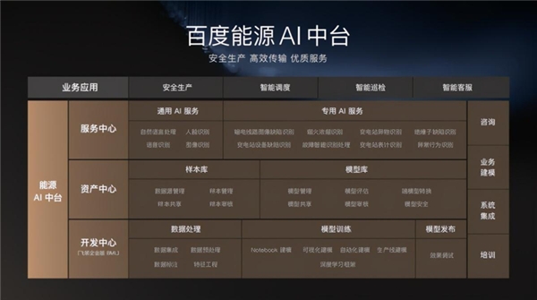在2020百度世界大會(huì)智能云分論壇上,百度智能云能源AI中臺(tái)首次正式對(duì)外發(fā)布。能源AI中臺(tái)為能源企業(yè)智能化升級(jí)提供從方法論、平臺(tái)、服務(wù)在內(nèi)的全套工具,幫助能源生產(chǎn)更安全,傳輸更高效,客戶服務(wù)更優(yōu)質(zhì)?;谀茉碅I中臺(tái)解決方案,能源企業(yè)可以更快速地實(shí)現(xiàn)上層的智能應(yīng)用,快速搭建“數(shù)據(jù)+平臺(tái)+應(yīng)用”的新模式,并且具備持續(xù)創(chuàng)新、不斷演進(jìn)的自生能力。