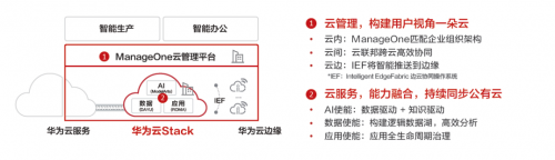 以華為云為例來看,針對(duì)客戶智能轉(zhuǎn)型的需求。華為云Stack重新定義混合云,提供公有云的能力,本地化的部署,從資源混合到能力融合,兼顧公有云快速創(chuàng)新能力和私有云的可管可控,匹配政企組織架構(gòu)和業(yè)務(wù)流程,在用戶視角來看就是“一朵云”。