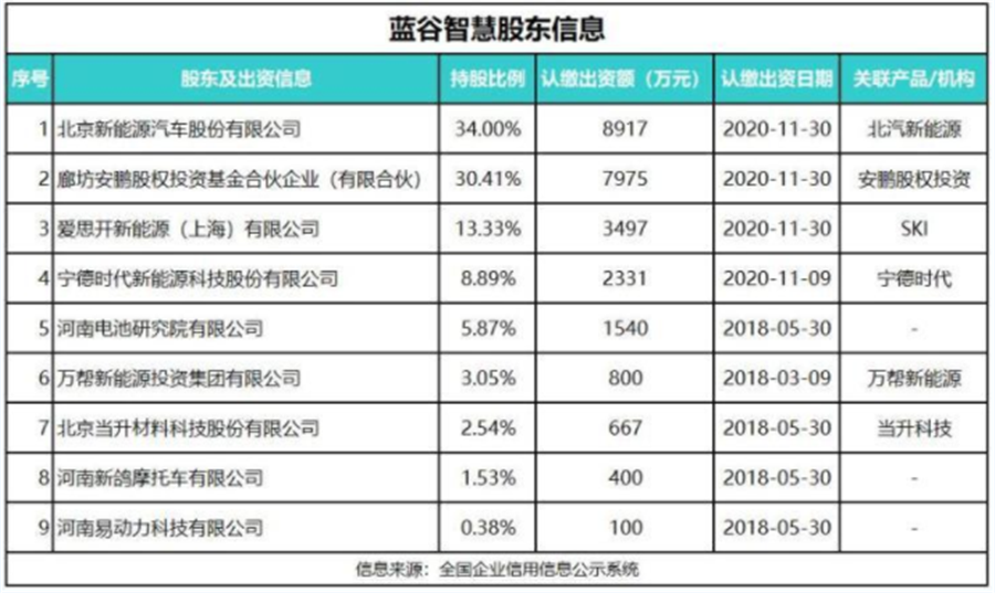 公開信息顯示,藍谷智慧目前的股東共有9位,北汽新能源持股比例最高達34%。其他幾家股東也是新能源汽車產業(yè)鏈企業(yè),包括電池生產企業(yè)寧德時代、SKI,電動原材料企業(yè)當升科技,以及充電基礎設施企業(yè)萬幫新能源等。