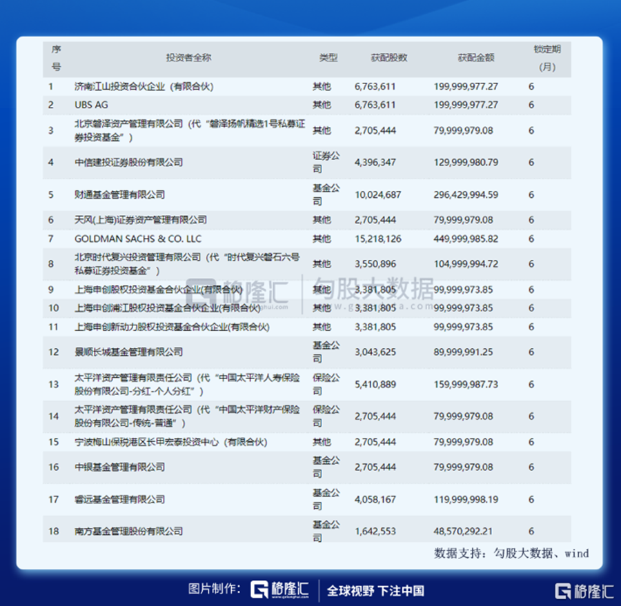 獲配最多的一家機(jī)構(gòu)是境外機(jī)構(gòu)投資者GOLDMAN SACHS & CO. LLC,共獲配1521.8萬股,獲配金額為4.5億元,第二的是財通基金管理有限公司,獲配1002.4萬股,獲配金額2.96億元。景順和睿遠(yuǎn)資金較小,在1億以下。