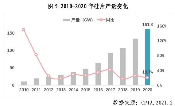 盡管受到年初的疫情沖擊、7-8月多晶硅料企業(yè)安全事故及新疆地區(qū)疫情導(dǎo)致的硅料供應(yīng)緊張、以及7月開(kāi)始由于光伏玻璃、EVA膠膜等供應(yīng)緊張導(dǎo)致的原輔材料價(jià)格上漲等黑天鵝事件,我國(guó)光伏產(chǎn)業(yè)在國(guó)內(nèi)外市場(chǎng)的推動(dòng)下,規(guī)模持續(xù)擴(kuò)大。其中,多晶硅產(chǎn)量39.2萬(wàn)噸,同比增長(zhǎng)14.6%;硅片產(chǎn)量161.3GW,同比增長(zhǎng)19.7%;電池片產(chǎn)量134.8GW,同比增長(zhǎng)22.2%;組件產(chǎn)量124.6GW,同比增長(zhǎng)26.4%。