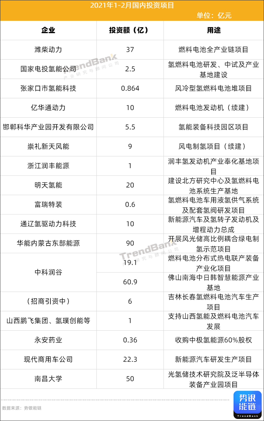 在國內(nèi),2021年氫電項目投資熱情不減。據(jù)勢銀能鏈不完全統(tǒng)計,2021年1月和2月,全國項目總投資/募資金額約346億元。