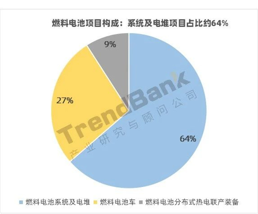 在11個燃料電池項目,燃料電池系統(tǒng)及電堆項目7個,占比約64%;燃料電池車項目3個,占比約27%;燃料電池分布式熱電聯(lián)產(chǎn)裝備項目1個。