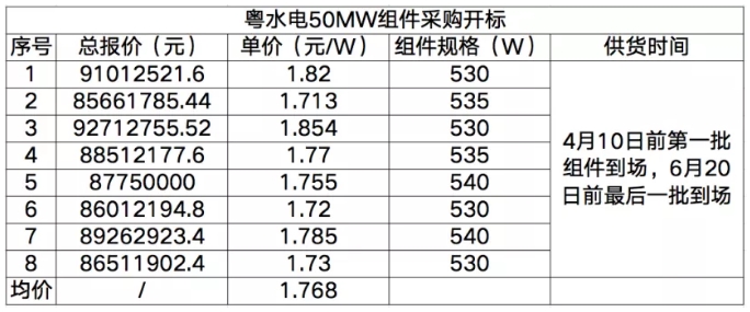 3月10日,遂溪縣粵水電官田水庫50MW光伏項(xiàng)目組件采購開標(biāo),共8家組件企業(yè)參與投標(biāo)。本次招標(biāo)組件規(guī)格為530W以上單晶雙玻組件,最高投標(biāo)報(bào)價(jià)為1.854元/W,最低報(bào)價(jià)為1.713元/W,均價(jià)為1.768元/W。具體開標(biāo)價(jià)格見下: