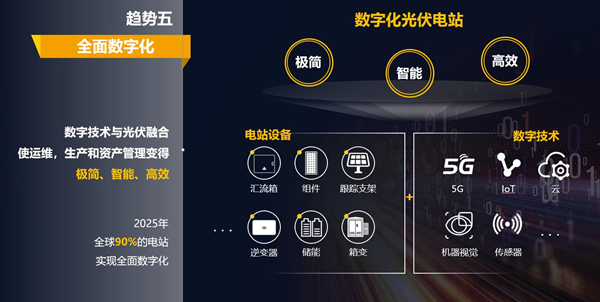 數(shù)字技術(shù)與光伏技術(shù)融合,使運維、生產(chǎn)管理和資產(chǎn)管理變得極簡、智能、高效。數(shù)字化是智能化基礎(chǔ)。隨著5G、云等數(shù)字化技術(shù)快速演進,預(yù)計2025年將有90%以上的電站實現(xiàn)全面數(shù)字化,讓光伏電站極簡、智能、高效的管理成為可能,從一個啞電站變成一個有機的智能生命體。