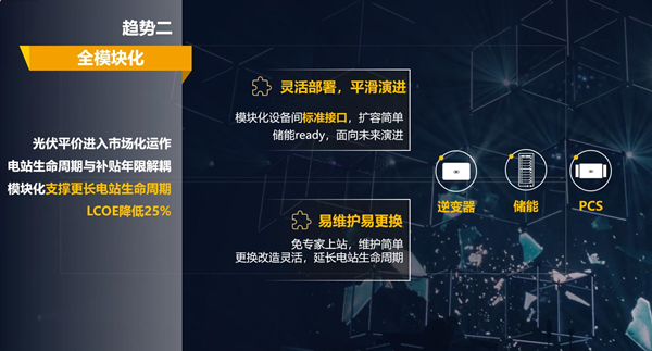 逆變器、PCS、儲能等關(guān)鍵核心部件,設(shè)備間采用標(biāo)準(zhǔn)接口,靈活擴容,快速部署;逆變器不管交流還是直流側(cè),具備儲能接口,面向未來演進。同時隨著光伏電站規(guī)模和復(fù)雜度越來越高,專家上站維護的傳統(tǒng)模式成本過高。模塊化設(shè)計可以實現(xiàn)免專家維護,極大降低運維成本、提升系統(tǒng)可用度。全模塊化設(shè)計將成為行業(yè)主流。