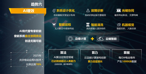 受益于人工智能及物聯(lián)網(wǎng)技術(shù),通過集成海量的專家經(jīng)驗和不斷的自學(xué)習(xí),讓算法、算力、算據(jù)在計算中發(fā)揮最大作用,AI將在很大程度上代替運維專家進行診斷決策。通過智能跟蹤算法,讓組件、支架、逆變器協(xié)同運行,找到最佳角度,釋放最大潛力。智能IV診斷,精準(zhǔn)定位故障,將運維工作量從“月”降低到“分鐘”。無人機空中巡檢電站、清洗機器人清洗組件、智能安防和人臉識別等技術(shù),使光伏電站不斷完善系統(tǒng)設(shè)計優(yōu)化、故障診斷、光儲協(xié)同、智能巡檢、智能清洗、機器視覺,全面提升發(fā)電效率和重構(gòu)運維體驗。從而助力電站生產(chǎn)力和安全性提升。預(yù)計到2025年,光伏電站應(yīng)用AI技術(shù)比例達到70%。