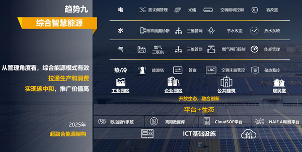 能源結(jié)構(gòu)轉(zhuǎn)向新一代綜合能源系統(tǒng)。從管理角度看,綜合能源模式會有效拉通生產(chǎn)和消費,助力實現(xiàn)碳中和,推廣價值更高。綜合能源是源-網(wǎng)-荷-儲一體化的自治系統(tǒng),需要以ICT基礎(chǔ)設(shè)施為底座,通過平臺+生態(tài)理念,融合創(chuàng)新,提升能源利用效率,降低能源成本。預(yù)計2025年,超融合能源架構(gòu)會大行其道。