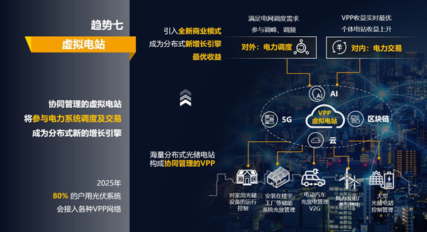 5G、區(qū)塊鏈、云服務(wù)等ICT技術(shù)的大規(guī)模應(yīng)用于分布式電站,組成協(xié)同管理的虛擬電站參與到電力系統(tǒng)的調(diào)度、交易與輔助服務(wù)中。未來5年,虛擬電站技術(shù)的發(fā)展會在分布式光伏場景中衍生出新的商業(yè)模式,以及新的市場參與者,成為分布式新的增長引擎。預(yù)計2025年,80%的戶用光伏系統(tǒng)會接入各種VPP網(wǎng)絡(luò)。