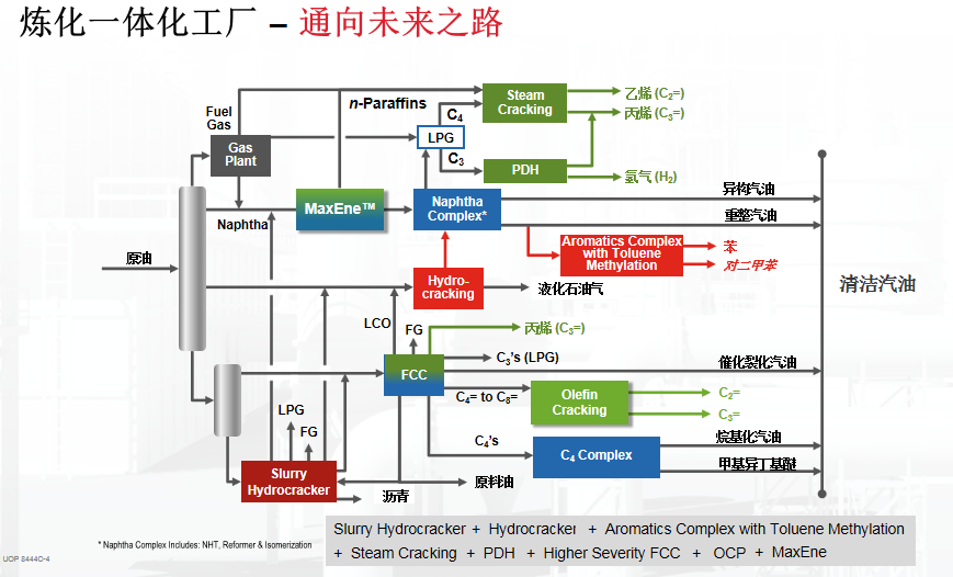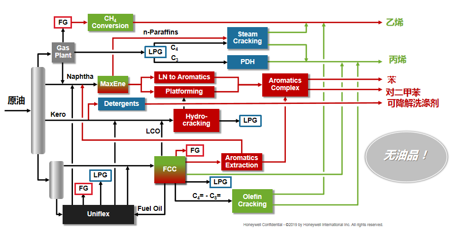 在了解煉廠的生產(chǎn)原理和規(guī)律后,技術(shù)人員又如何將現(xiàn)有多產(chǎn)油品的煉廠改造成多產(chǎn)石化產(chǎn)品的工廠呢?舉個(gè)例子,煉廠如果有以生產(chǎn)汽油為主的催化裂化(FCC)裝置,我們可以將其改造成多產(chǎn)丙烯的模式,由FCC出來的C4+烯烴也可以通過烯烴裂解來更進(jìn)一步增產(chǎn)丙烯和乙烯;在煉廠添加芳烴抽提和二甲苯裝置,則可以完成重整從生產(chǎn)高辛烷值汽油到生產(chǎn)芳烴的改造。如果我們將煉廠的重油裝置改為加氫裂解的UNIFLEX裝置,就可以將95%以上的碳回收成輕油,這些輕油可以通過裂解反應(yīng)生產(chǎn)石化產(chǎn)品的原料。催化裂化的循環(huán)油由于本身含有芳環(huán)也可以用來直接去生產(chǎn)芳烴。