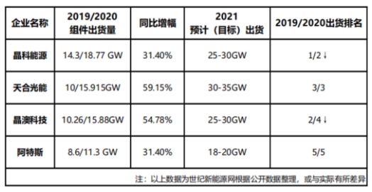 2021年,各家企業(yè)在2020年出貨量的基礎上相繼調(diào)高出貨目標。相關材料顯示:晶科在2021年預計(目標)出貨量為25-30GW,相較2020年增長33.2%-59.8%;天合預計(目標)出貨量30-35GW,相較2020年增長88.5%-119.95;晶澳預計(目標)出貨量25-30GW,相較2020年增長57.4%-88.9%;阿特斯預計(目標)出貨量18-20GW,相較2020年增長59.3%-77%。
