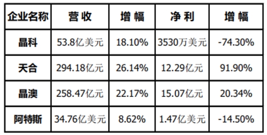 從晶科、天合、晶澳、阿特斯年報不難發(fā)現(xiàn),各家營收額全面上浮。晶科營收晶科營收53.8億美元(約合352.6億元人民幣),同增18.10%;天合營收294.18億,同增26.14%;晶澳營收258.47億,同增22.17%;阿特斯營收34.76億美元(約合227.5億元),同增8.62%。