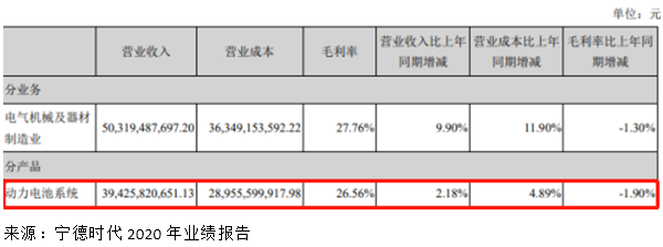 根據(jù)動(dòng)力電池289.56億元的營(yíng)業(yè)成本來(lái)看,寧德時(shí)代2020年動(dòng)力電池系統(tǒng)的平均單價(jià)成本約為0.65元/Wh,而2019年寧德時(shí)代的這一數(shù)字為0.67元/Wh,下降幅度很小。作為比較,2018年寧德時(shí)代動(dòng)力電池系統(tǒng)的平均成本為0.758元/Wh,2019年較2018年下降較為明顯,而2020年較2019年下降區(qū)間大幅收窄。