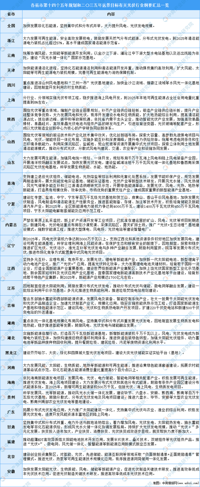 全國各地積極促進光伏行業(yè)發(fā)展,中商產業(yè)研究院整理了全國各省市“十四五”發(fā)展規(guī)劃建議/綱要中有關光伏行業(yè)發(fā)展相關內容,以供參考: