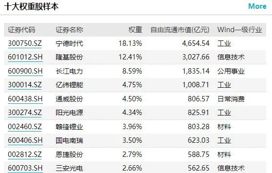 Wind數(shù)據(jù)顯示,光伏設(shè)備、儲(chǔ)能設(shè)備、水電等行業(yè)的權(quán)重占比較高,依次為29.8%、23%、11%,是未來我國(guó)新能源重點(diǎn)發(fā)展的領(lǐng)域,受到“碳中和”政策的催化。從成分股來看,中證內(nèi)地低碳經(jīng)濟(jì)主題指數(shù)所篩選的成分股為低碳主題龍頭,寧德時(shí)代和隆基股份權(quán)重最大的兩家公司。