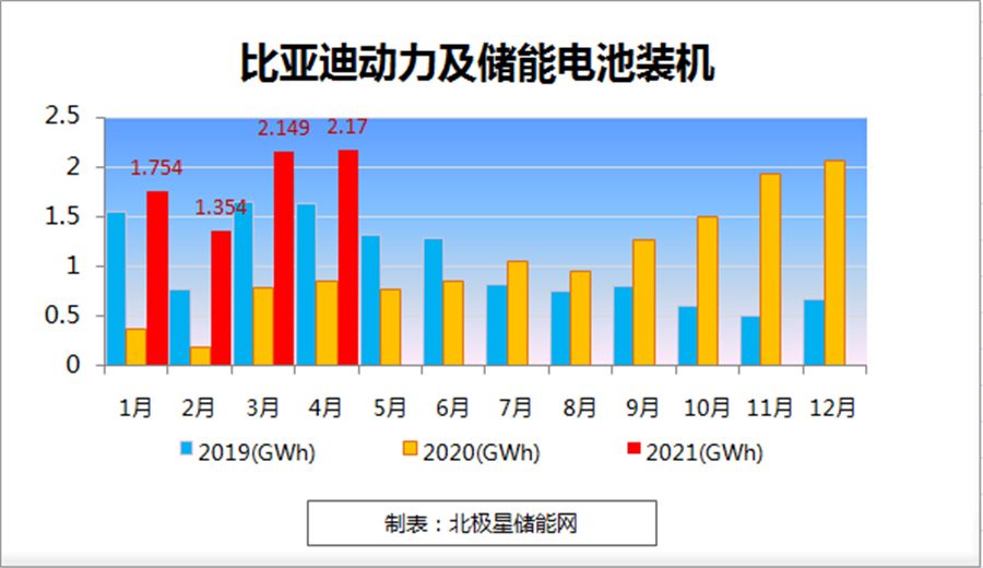 近日,比亞迪官方公布了2021年4月產銷情況。2021年4月新能源汽車動力電池及儲能電池裝機總量約為 2.170GWh,本年累計裝機總量約為 7.428GWh。