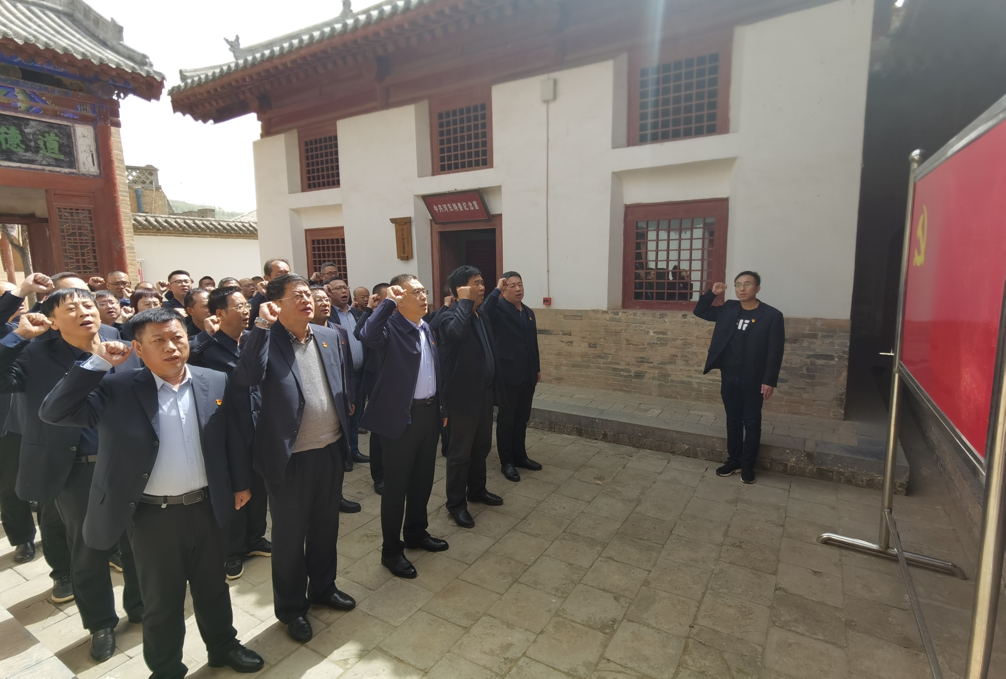 堆云洞自1965年以“河?xùn)|特委活動(dòng)舊址”公布為山西省重點(diǎn)文物保護(hù)單位。它位居稷王山前麓的丘嶺地帶。1928年6月,省委派汪銘來河?xùn)|恢復(fù)黨組織期間,在嘉康杰引薦下,于堆云洞召開“河?xùn)|地區(qū)黨組織會(huì)議”,成立了河?xùn)|特委。1929年7月又在堆云洞召開“河?xùn)|特委會(huì)議”,改特委為特支。1937年11月,在聞、夏一帶為八路軍擴(kuò)兵500,同年12月,中共北方局在臨汾劉村召開山西黨的活動(dòng)分子會(huì)議上,劉少奇稱贊嘉康杰是河?xùn)|“群眾領(lǐng)袖”。這里沿狹窄石階,拾級(jí)而上,大家參觀了嘉康杰等革命先烈當(dāng)時(shí)秘密印發(fā)文件和傳單的三拐窯、召開秘密會(huì)議的暗室以及與敵人周旋脫身的水井等遺址。在“河?xùn)|黎明前的曙光”展、嘉康杰同志主題展前,認(rèn)真閱覽革命事跡圖文展覽。大家在堆云洞景區(qū),在河?xùn)|特委革命舊址前,全體黨員干部面對(duì)鮮艷的黨旗,高舉右手,再次莊嚴(yán)宣誓:我志愿加入中國共產(chǎn)黨……隨時(shí)準(zhǔn)備為黨和人民犧牲一切,永不叛黨!鏗鏘恢弘的誓詞,一字一句,神圣而豪邁,再次洗禮大家的心靈。