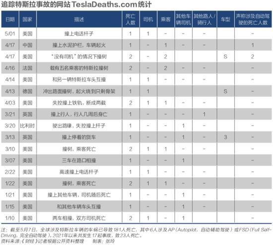 追蹤特斯拉事故的網(wǎng)站TeslaDeaths.com統(tǒng)計(jì),截至5月7日,全球涉及特斯拉車輛的車禍已導(dǎo)致181人死亡,其中6人涉及AP(Autopilot,自動(dòng)輔助駕駛)或FSD(Full Self-Driving,完全自動(dòng)駕駛)。2021年以來(lái)共發(fā)生17起事故,致23人死亡。(見下圖表)